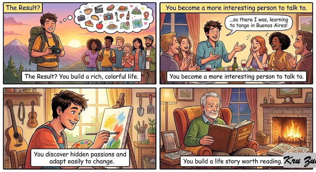 The Result? You build a rich, colorful life. You become a more interesting person to talk to. You discover hidden passions and adapt easily to change. You build a life story worth reading. 📖