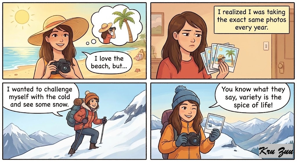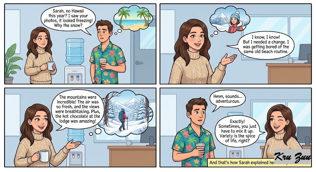 Situation: You are making small talk at work. You just came back from a vacation, but instead of a beach, you went hiking in a snowy mountain. Your colleague asks why you didn’t just go to Hawaii like usual.