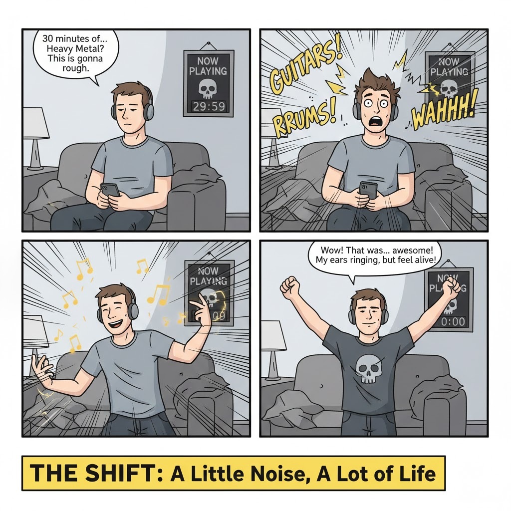 Listen to a playlist of a music genre you usually ignore (Jazz, Heavy Metal, Classical) for 30 minutes.
