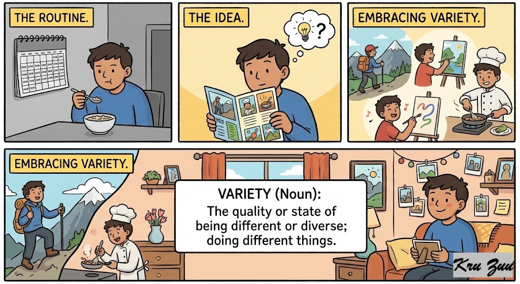 Variety (Noun): The quality or state of being different or diverse; doing different things.