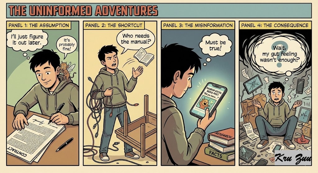 You guess. You assume. You sign contracts without reading the fine print. 🙈 “I’ll just figure it out later.””Who needs the manual?””I saw it on a random social media post, so it must be true!” You act as if your gut feeling is a substitute for actual facts. You disconnect the value of research from the reality of consequences.
