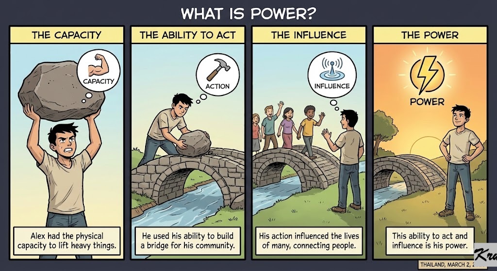 Power (Noun): The ability or capacity to do something or act in a particular way; influence.