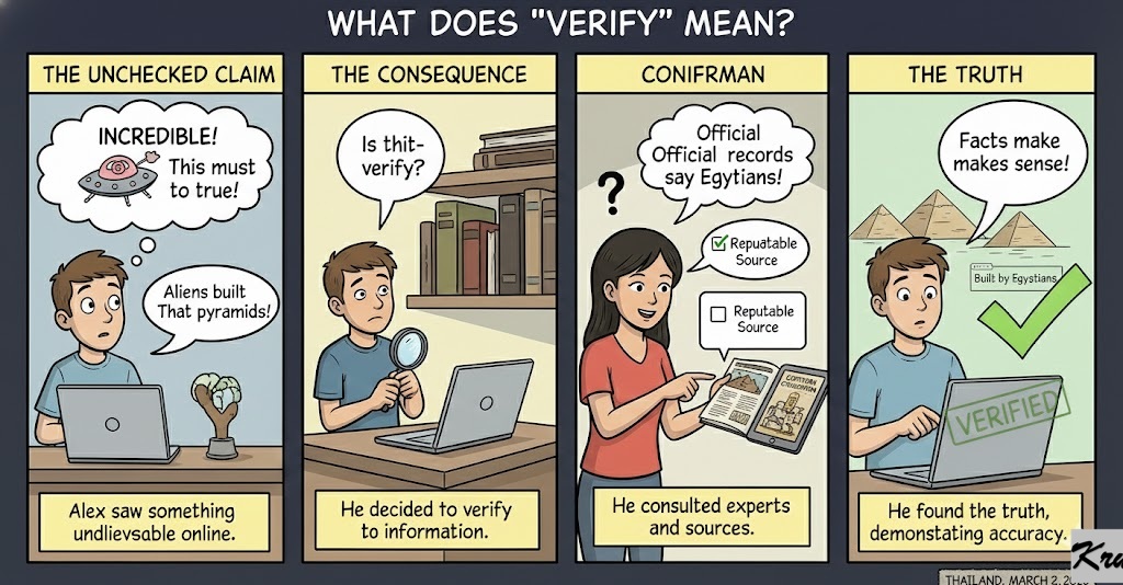 Verify (Verb): Make sure or demonstrate that (something) is true, accurate, or justified.