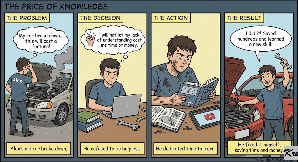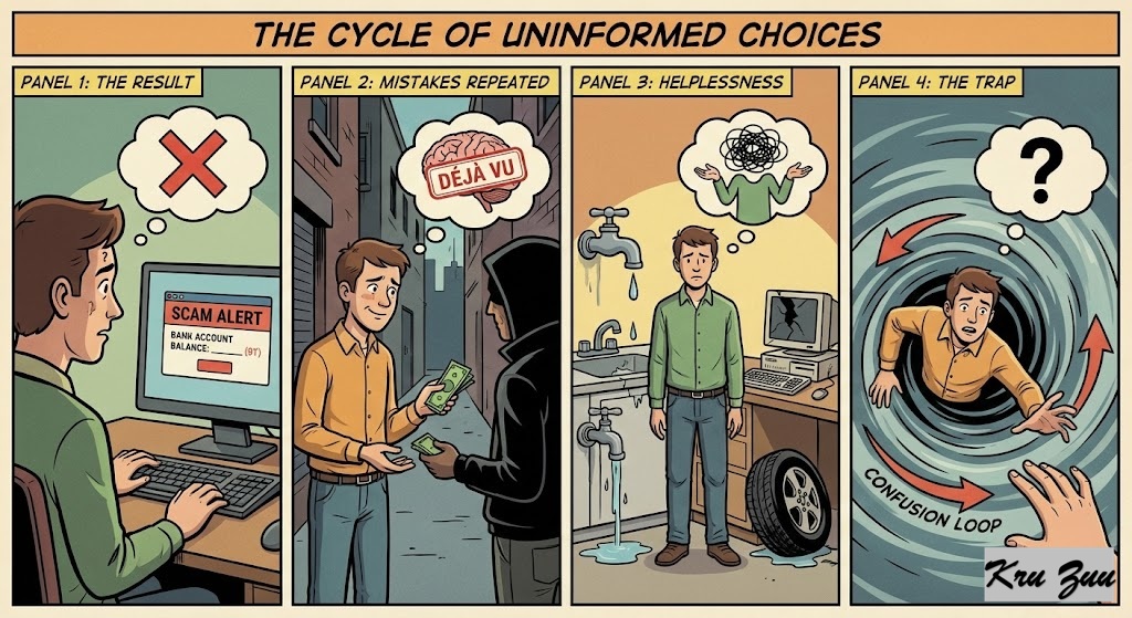 The Result? You are easily scammed. You make the same mistakes twice. You feel helpless when things break. You are trapped in the “Confusion Loop,” always depending on others to save you. 🌪️