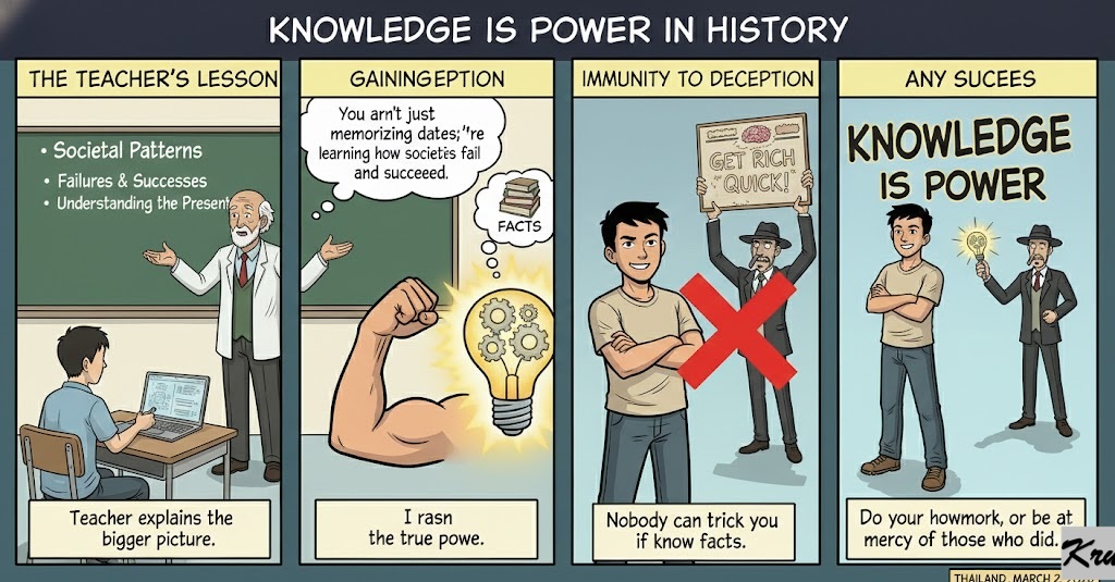 Teacher: “You aren’t just memorizing dates; you’re learning how societies fail and succeed. Nobody can trick you if you know the facts. Knowledge is power.”