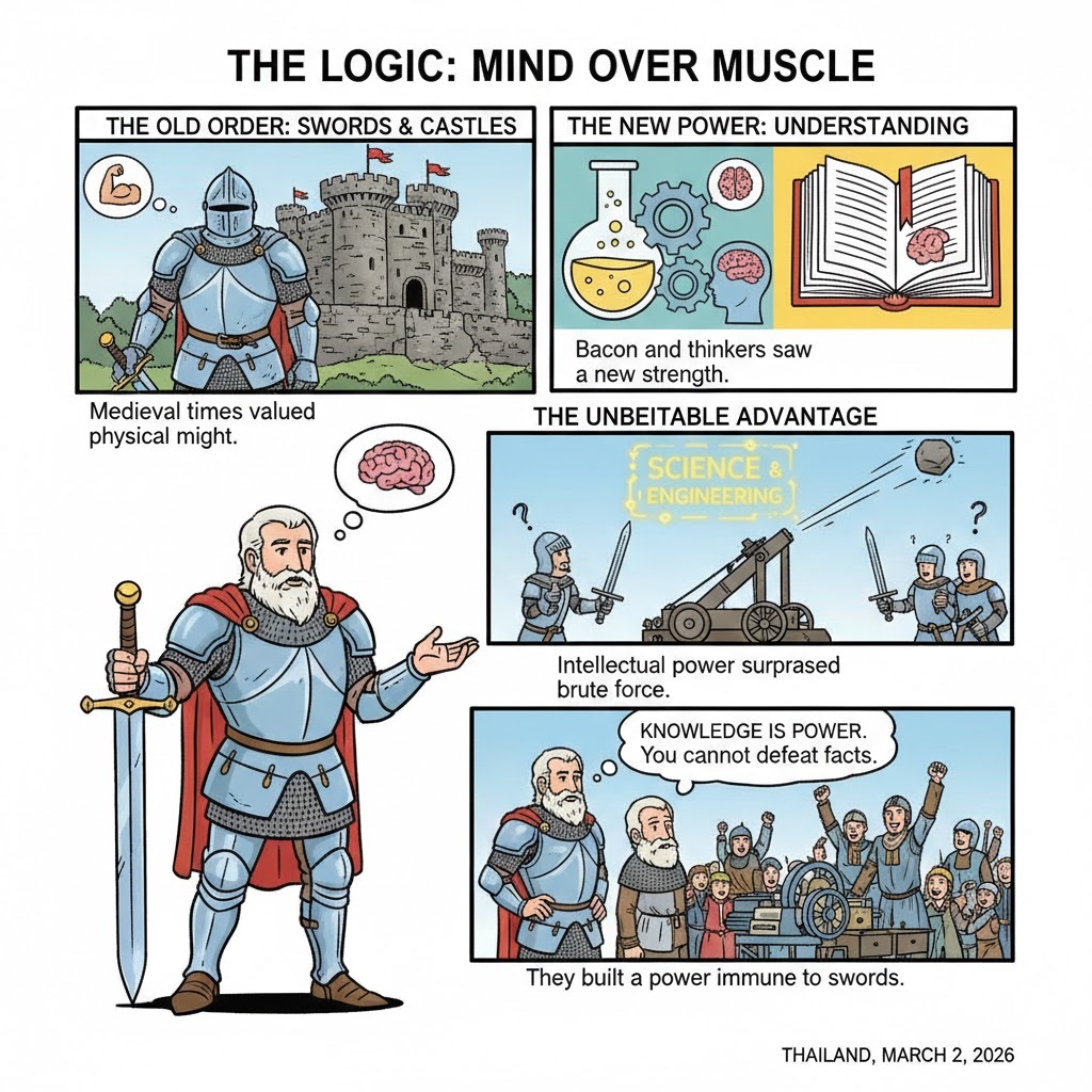 The Logic: In medieval times, physical strength (swords and castles) ruled. Bacon and other thinkers realized that understanding science, engineering, and human nature gave you an advantage that physical force could never beat.