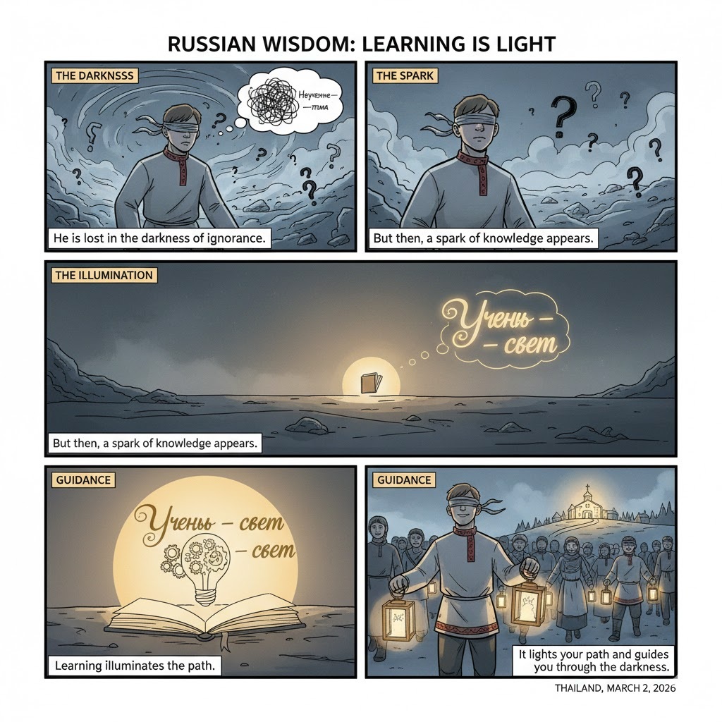 🇷🇺 Russian: “Ученье — свет, а неученье — тьма” — Learning is light, and ignorance is darkness.