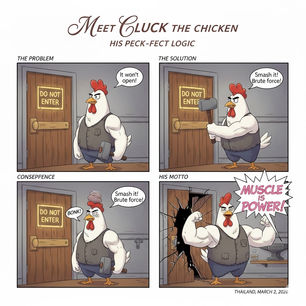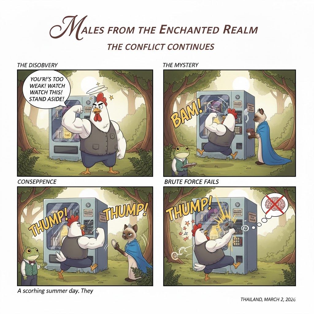 Cluck steps up. “You’re too weak! Watch this!” Cluck runs and headbutts the machine. BAM! He bounces off, dizzy and losing feathers. “Let’s just kick it until it breaks!” Cluck squawks, kicking the metal repeatedly.