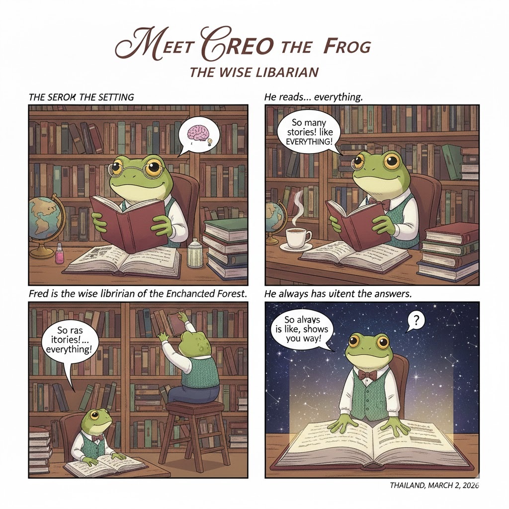 Fred the Frog: The wise, green librarian who reads everything. 🐸