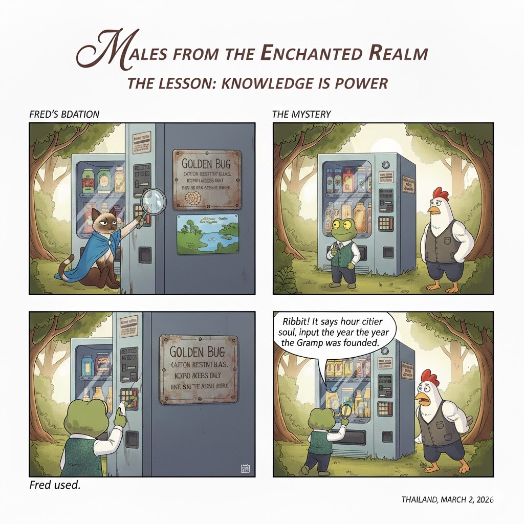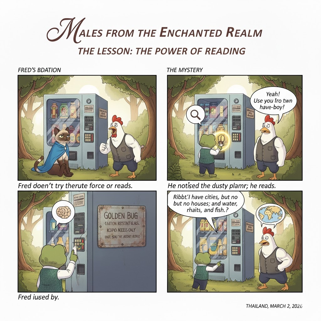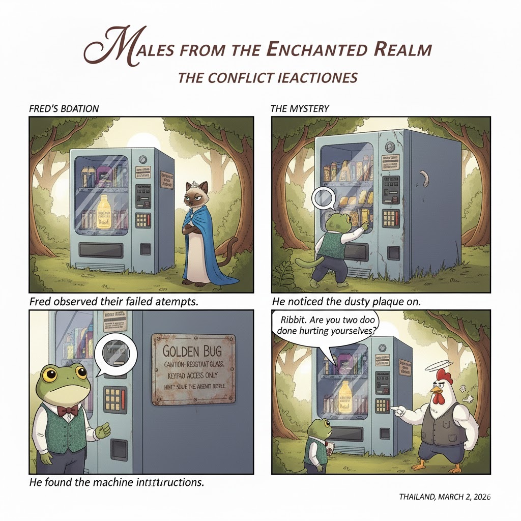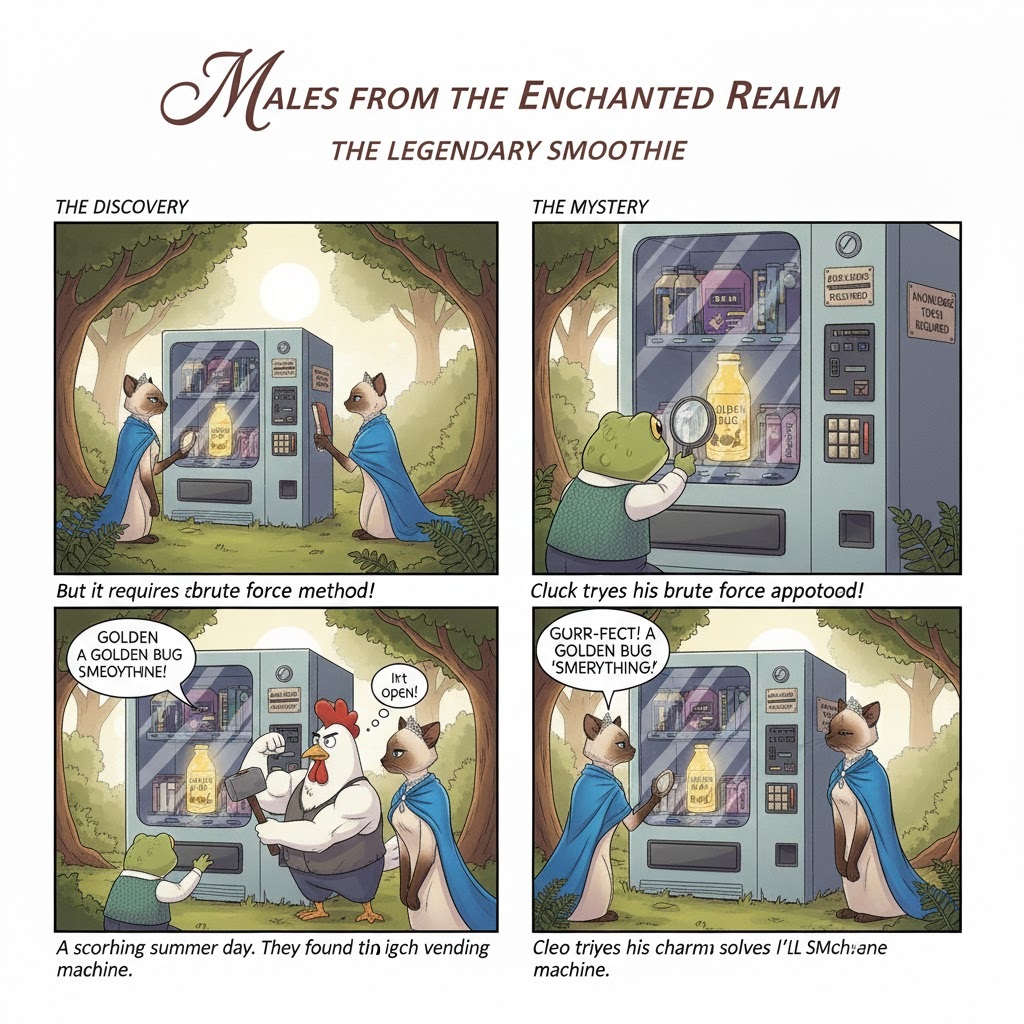 The Situation: It is a scorching summer day. Cleo, Cluck, and Fred find an abandoned, high-tech vending machine in the forest. Inside, glowing beautifully behind thick glass, is the legendary “Golden Bug Smoothie.”