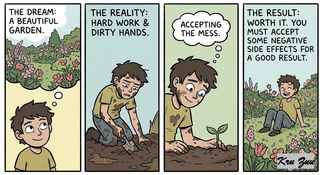 Simpler Version: To get a good result, you must accept some negative side effects.