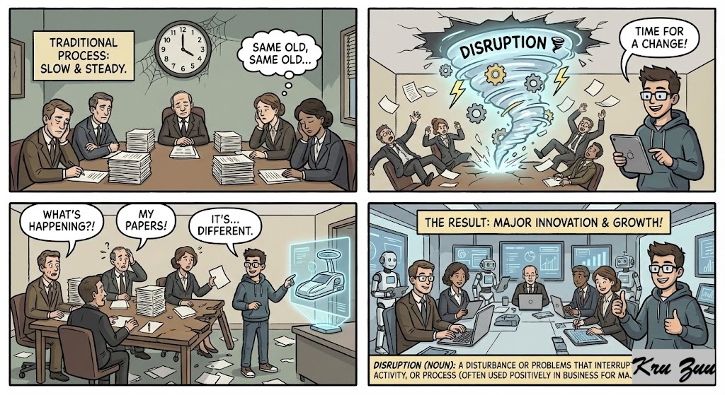 Disruption (Noun): A disturbance or problems that interrupt an event, activity, or process (often used positively in business for major innovation). 🌪️