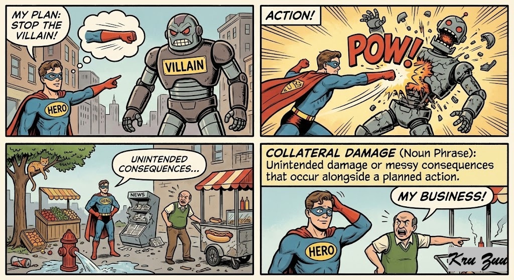 Collateral Damage (Noun Phrase): Unintended damage or messy consequences that occur alongside a planned action.