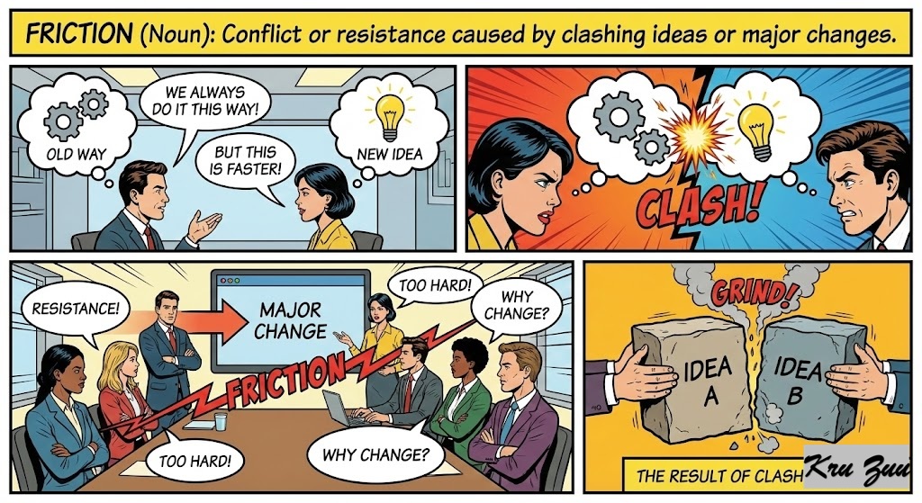Friction (Noun): Conflict or resistance caused by clashing ideas or major changes.