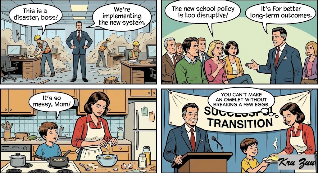 Leaders and parents often use this idiom to justify a tough but necessary decision, shutting down complaints about the “messy” process.