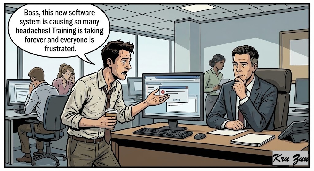 Employee: “Boss, this new software system is causing so many headaches! Training is taking forever and everyone is frustrated.”