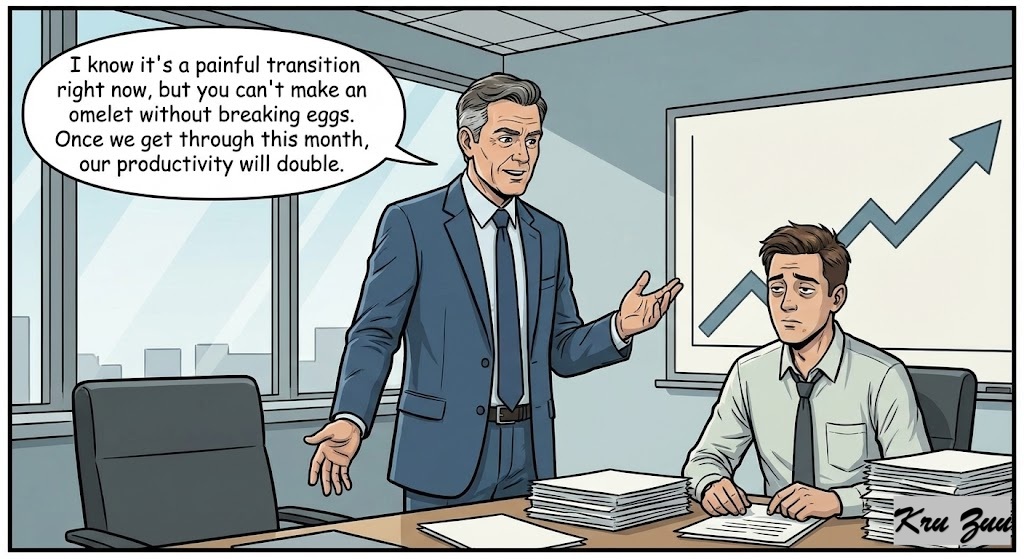 Boss: “I know it’s a painful transition right now, but you can’t make an omelet without breaking eggs. Once we get through this month, our productivity will double.”