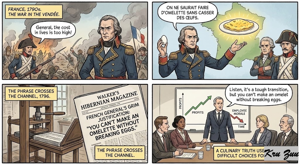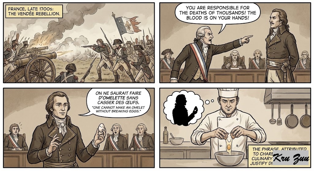 The Origin: The phrase is widely attributed to François de Charette, a French Royalist leader during the French Revolution (late 1700s). When accused of being responsible for the loss of lives during his rebellion, he reportedly replied: “On ne saurait faire d’omelette sans casser des œufs.” (One cannot make an omelet without breaking eggs).