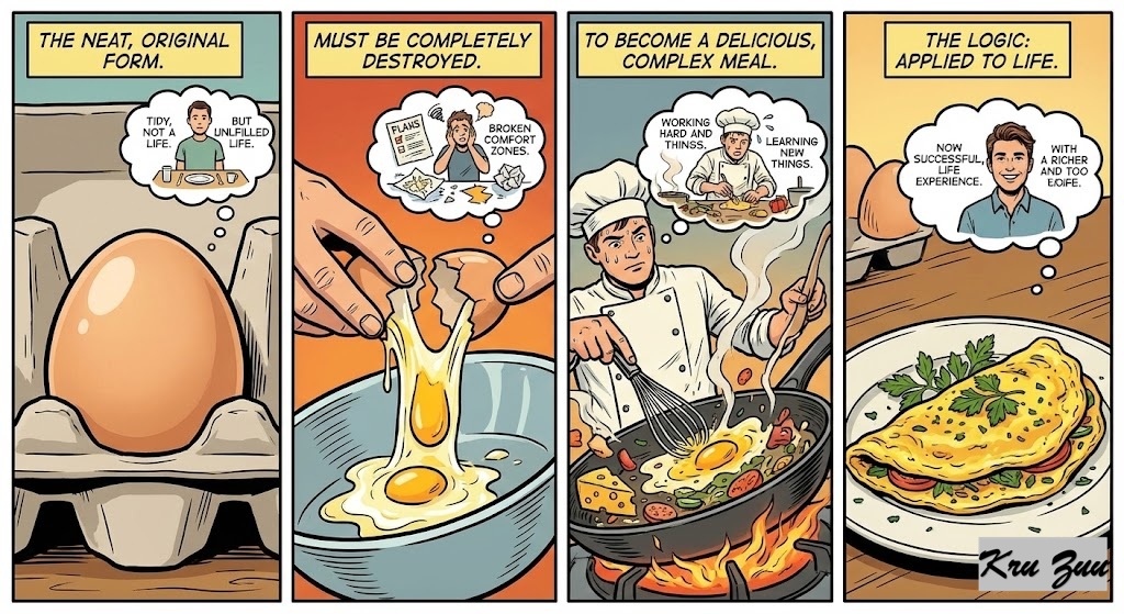 The Logic: It is a literal kitchen truth applied to life. An egg must be completely destroyed from its original, neat form to become a delicious, complex meal.