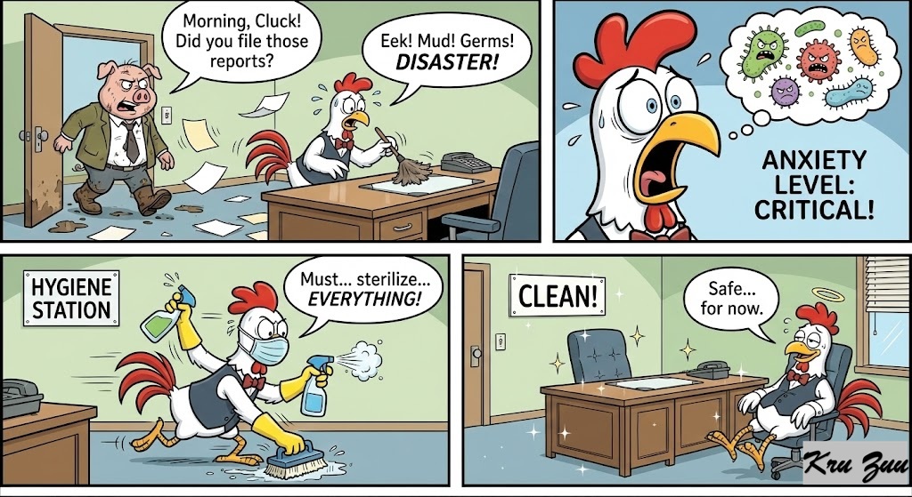 Cluck the Chicken: The highly anxious, cleanliness-obsessed assistant. 🐔
