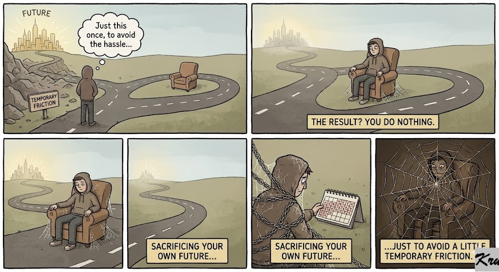 The Result? You do nothing. You stay stuck in the same place. You sacrifice your own future just to avoid a little temporary friction. 🕸️