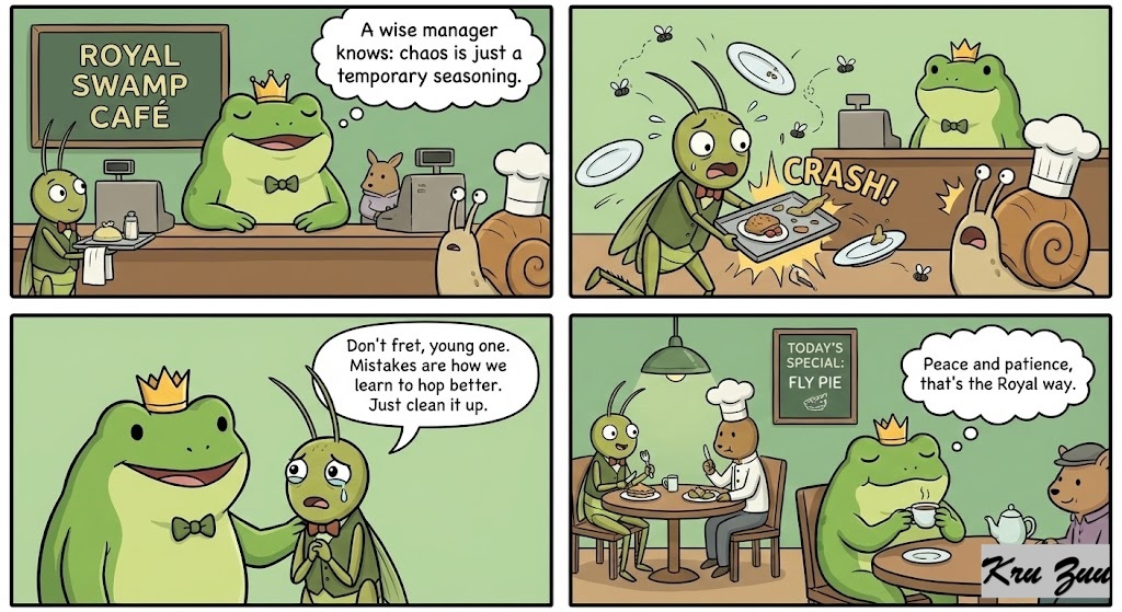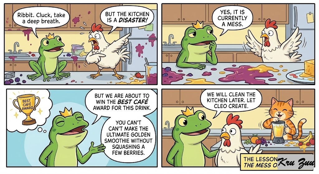 The Lesson: Fred turns to the panicking chicken. “Ribbit,” says Fred calmly. “Cluck, take a deep breath.” “But the kitchen is a disaster!” Cluck squawks, pointing at the sticky counters. Fred nods. “Yes, it is currently a mess. But we are about to win the Best Café Award for this drink. As the humans say, you can’t make an omelet without breaking eggs… or in this case, you can’t make the Ultimate Golden Smoothie without squashing a few berries. We will clean the kitchen later. Let Cleo create.”