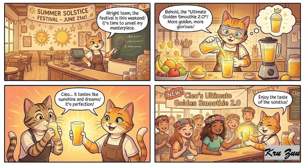The Situation: The café is preparing for the highly anticipated “Summer Solstice Festival.” Cleo the Cat has decided to upgrade their famous drink, inventing the “Ultimate Golden Smoothie 2.0.”
