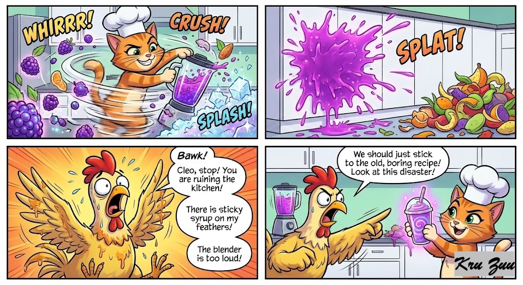 The Conflict: To make this masterpiece, Cleo is moving at lightning speed. She’s blending exotic glowing berries, crushing magic ice, and tossing ingredients everywhere. A splash of glowing purple juice hits the pristine walls. A pile of discarded fruit peels builds up on the floor. Cluck the Chicken starts hyperventilating, flapping his wings wildly. “Bawk! Cleo, stop! You are ruining the kitchen! There is sticky syrup on my feathers! The blender is too loud! We should just stick to the old, boring recipe! Look at this disaster!”
