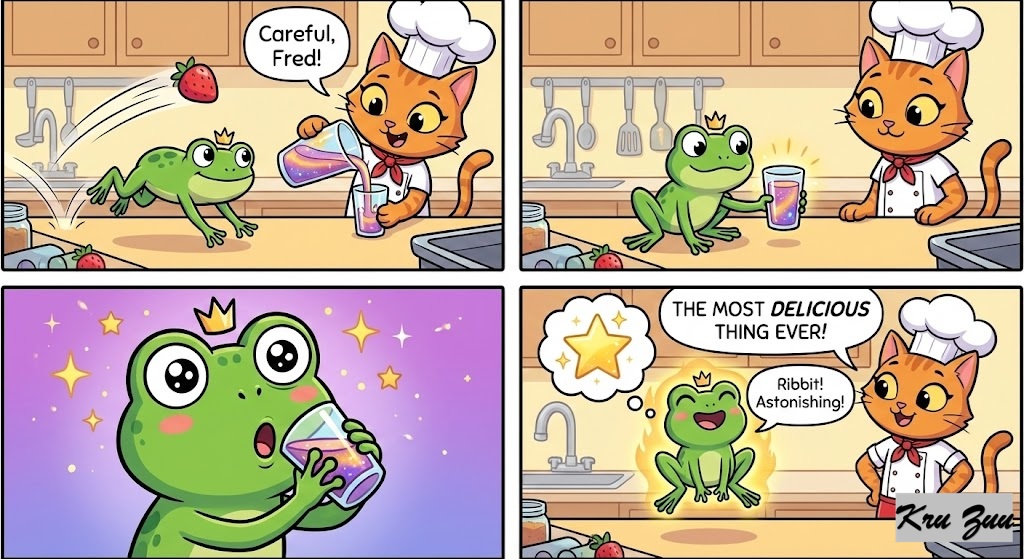 The Reaction: Fred the Frog hops onto the counter, carefully avoiding a flying strawberry. He takes a tiny sip of the bright, shimmering new smoothie Cleo just poured into a test glass. His eyes widen in amazement. It is the most delicious thing he has ever tasted.