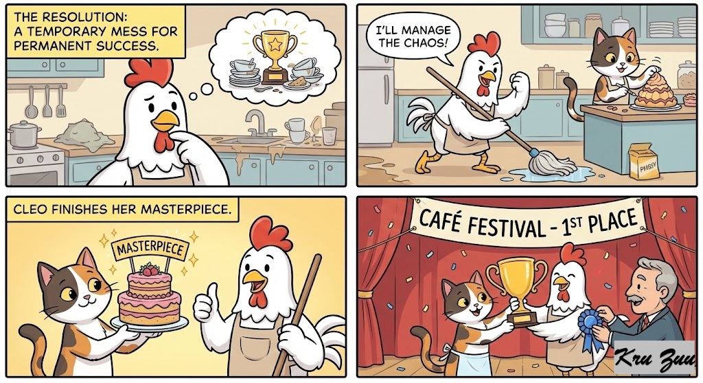 The Resolution: Cluck realizes the temporary mess is worth the permanent success. He grabs a mop to help manage the chaos instead of fighting it. Cleo finishes her masterpiece, and the café wins first place at the festival.