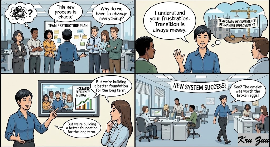 Situation: You are leading a project, restructuring a team, or introducing a new rule. People are complaining about the temporary inconvenience.