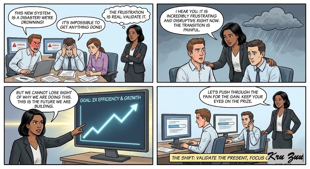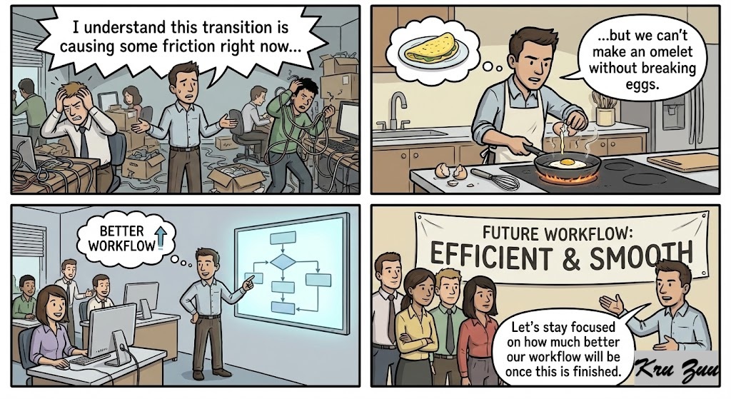 You Say: “I understand this transition is causing some friction right now, but we can’t make an omelet without breaking eggs. Let’s stay focused on how much better our workflow will be once this is finished.”