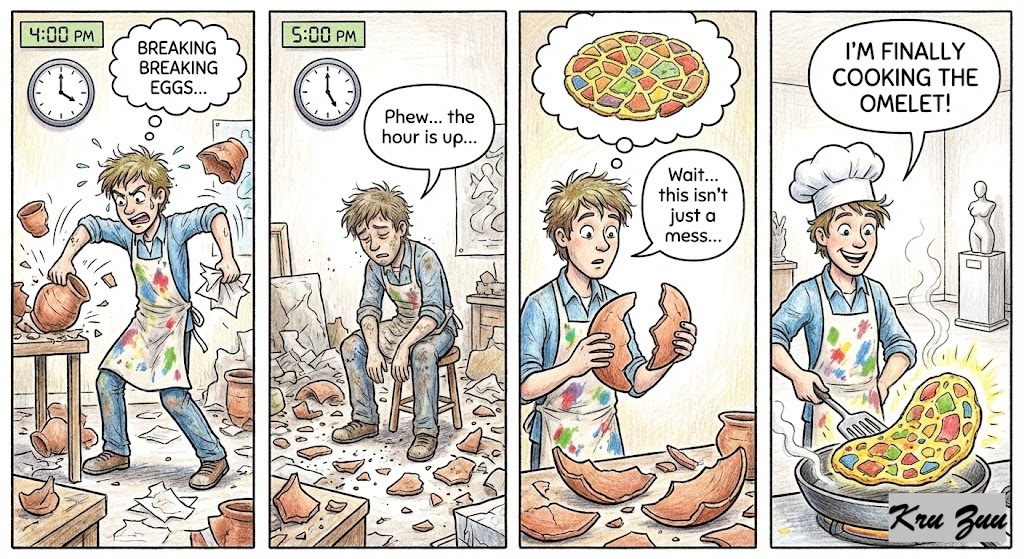 When the hour is up, look at what you accomplished. You broke the eggs, but you are finally cooking the omelet! 🍳