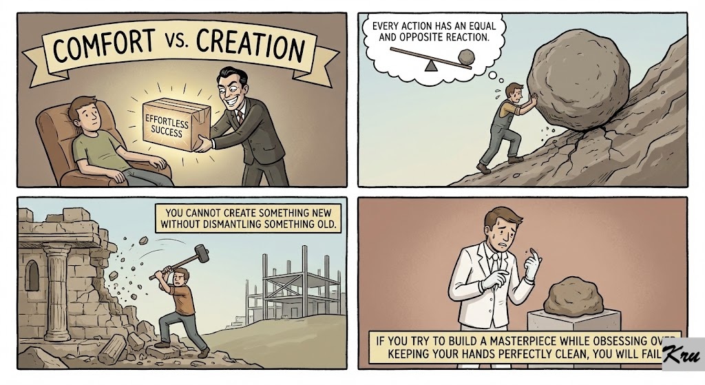 ⚖️ The Reality Comfort vs. Creation. We live in a world that sells us the illusion of “effortless success.” But the laws of achievement are grounded in physics: every action has an equal and opposite reaction. You cannot create something new without dismantling something old. If you try to build a masterpiece while obsessing over keeping your hands perfectly clean, you will fail.