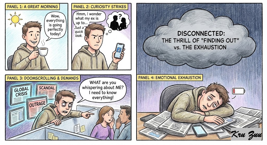 You have a great day going. But then, you get curious. You decide to check your ex’s social media. 📱 You demand to know exactly what your coworkers were whispering about. You endlessly doomscroll the 24-hour news cycle looking for things to be outraged by. You act as if knowing every single detail of the universe is your personal duty. You disconnect the thrill of “finding out” from the emotional exhaustion it causes.