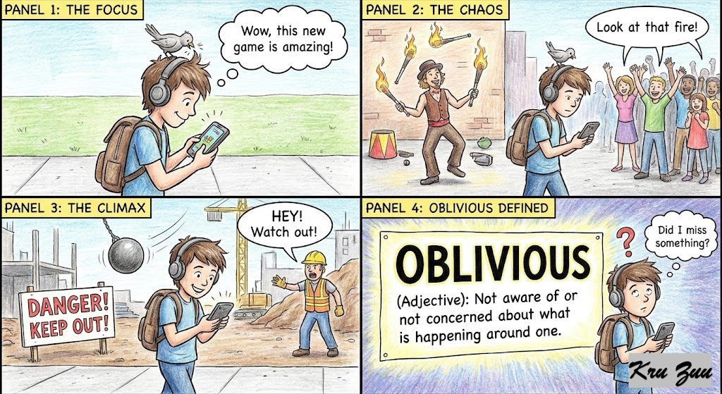 Oblivious(Adjective): Not aware of or not concerned about what is happening around one.