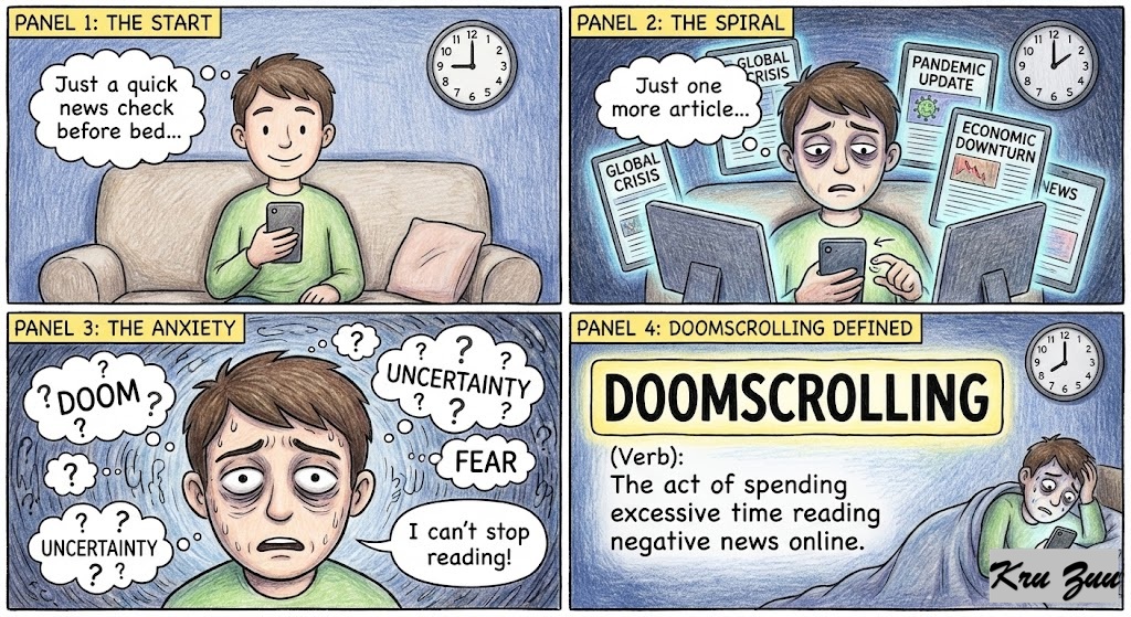 Doomscrolling(Verb): The act of spending excessive time reading negative news online.
