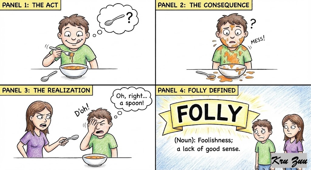 Folly(Noun): Foolishness; a lack of good sense.