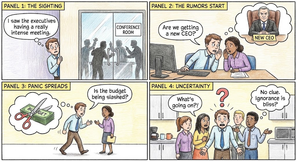 Employee: “I saw the executives having a really intense meeting. Are we getting a new CEO? Is the budget being slashed? What’s going on?!”