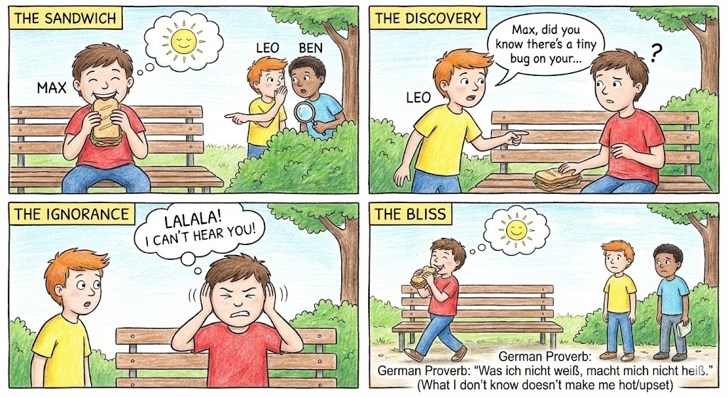 🇩🇪 German:“Was ich nicht weiß, macht mich nicht heiß.” (What I don’t know doesn’t make me hot/upset).