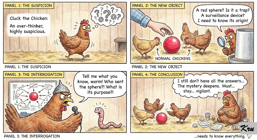 Cluck the Chicken: An over-thinker, highly suspicious, needs to know everything. 🐔