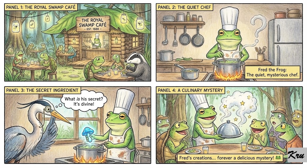Fred the Frog: The quiet, mysterious chef of the Royal Swamp Café. 🐸