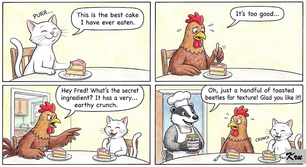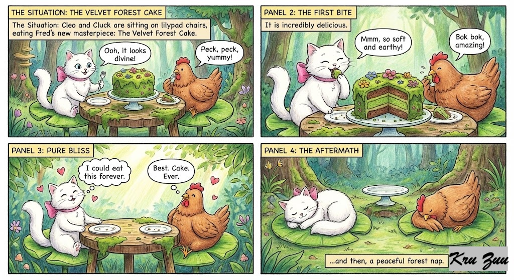 The Conflict: Cleo closes her eyes in pure joy. “This is the best cake I have ever eaten,” she purrs. Cluck, however, is poking his slice with a fork. “It’s too good,” Cluck squawks nervously. “Hey Fred! What’s the secret ingredient? It has a very… earthy crunch.”