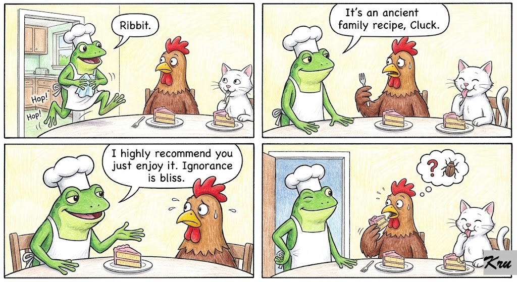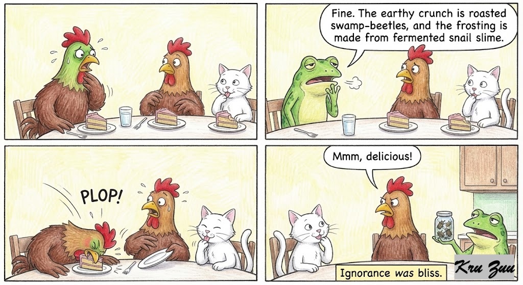Fred the Frog hops over, wiping his hands on his apron. “Ribbit. It’s an ancient family recipe, Cluck. I highly recommend you just enjoy it. Ignorance is bliss.”