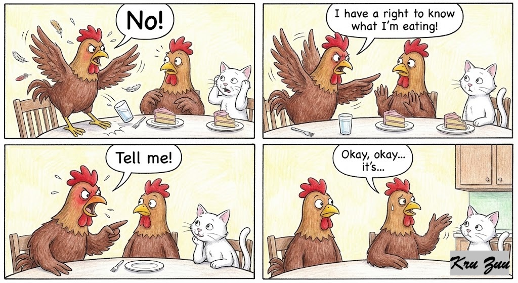 The Mistake: “No!” Cluck insists, flapping his wings. “I have a right to know what I’m eating! Tell me!”