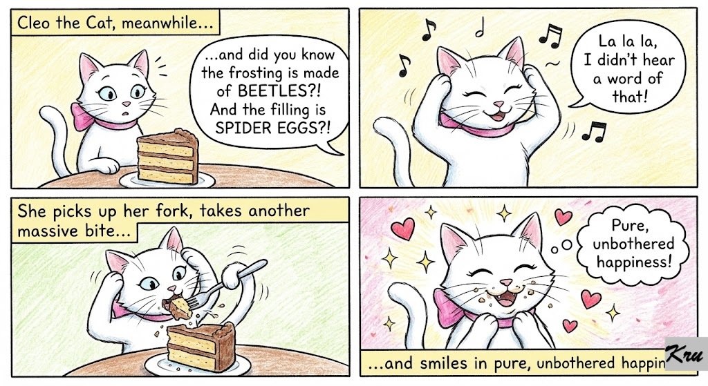 Cleo the Cat, meanwhile, elegantly puts her paws over her ears. “La la la, I didn’t hear a word of that!” she sings loudly. She picks up her fork, takes another massive bite of the cake, and smiles in pure, unbothered happiness.