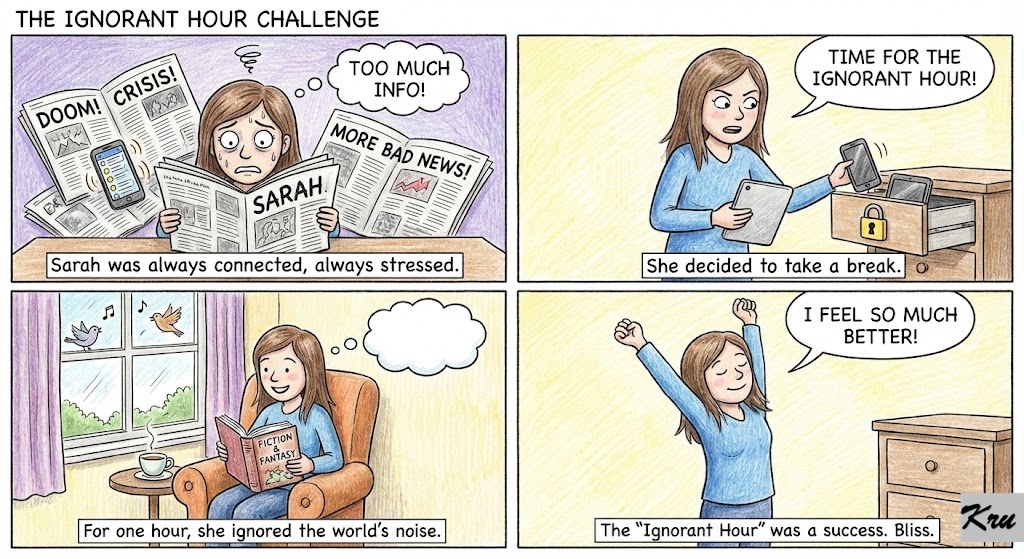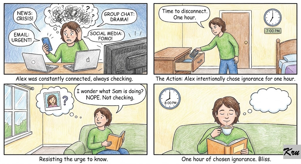 The Action: Once a day, for exactly one hour, intentionally choose ignorance. Put your phone in another room. Do not check the news. Do not check your emails. Do not look at group chats. If your brain says, “I wonder what [Person X] is doing right now…” actively choose not to find out.