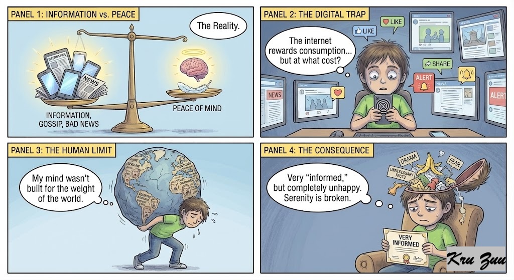 ⚖️ The Reality Information vs. Peace of mind. We live in a world where the internet rewards us for consuming every piece of data, gossip, and bad news available. But the human mind wasn’t built to carry the weight of the world. Serenity is hard to build and easy to break. If you treat your brain like a garbage dump for unnecessary drama, you will soon find yourself very “informed,” but completely unhappy.