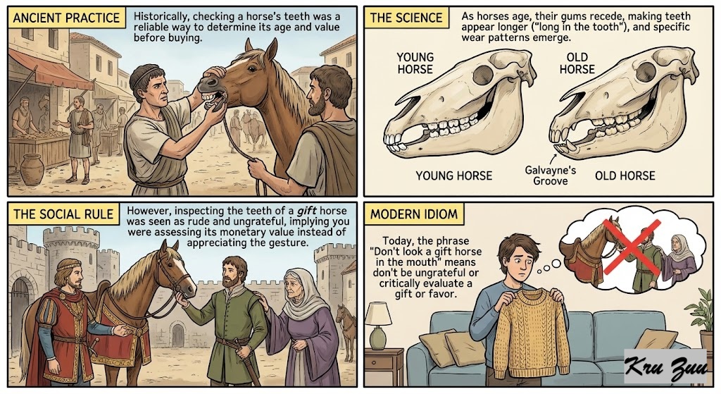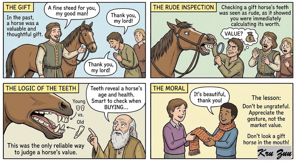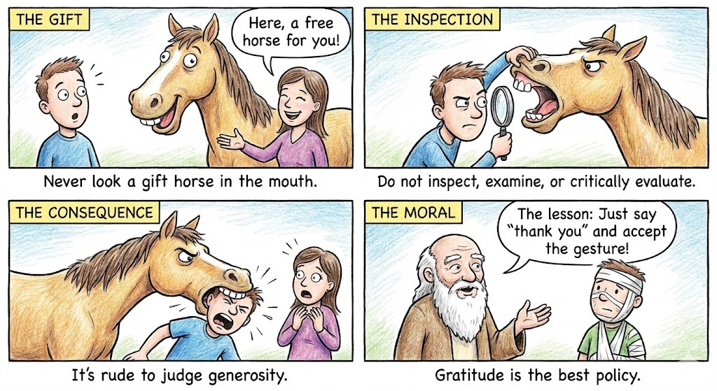 The Logic: As a horse ages, its teeth grow and change shape. In the past, the only reliable way to check a horse’s age (and therefore its financial value and health) was to pry open its mouth and inspect its teeth. Doing this to a horse you were buying was smart. Doing this to a horse that was given to you as a gift was incredibly rude, it showed you were immediately trying to calculate how much the gift was worth!