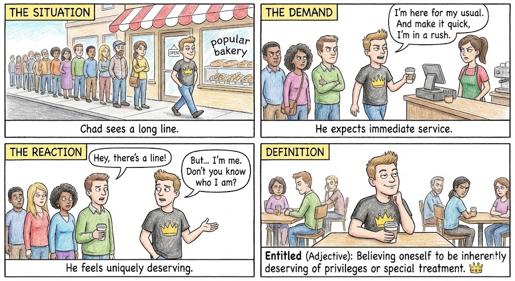 Entitled (Adjective): Believing oneself to be inherently deserving of privileges or special treatment.
